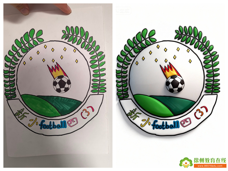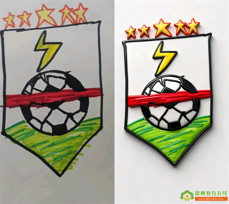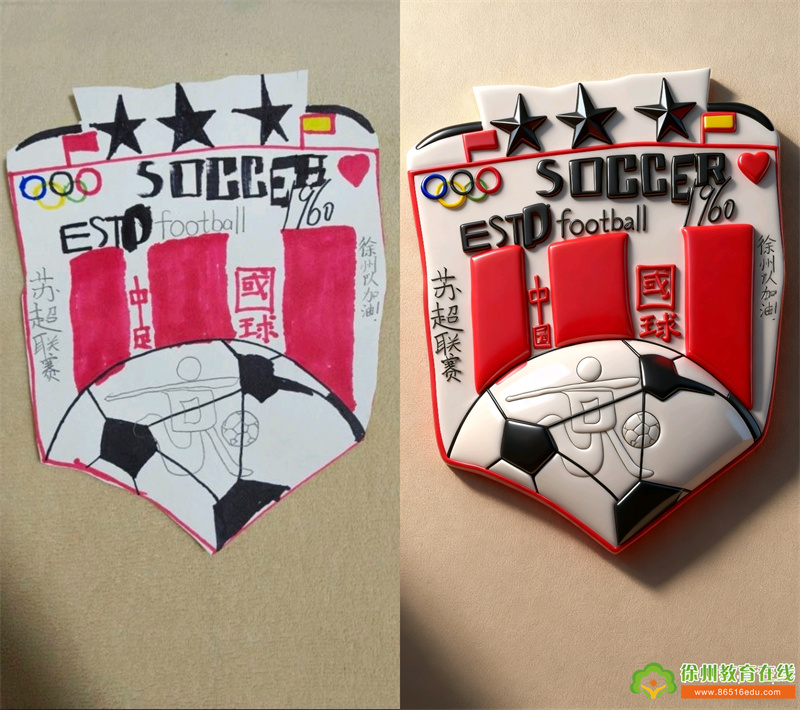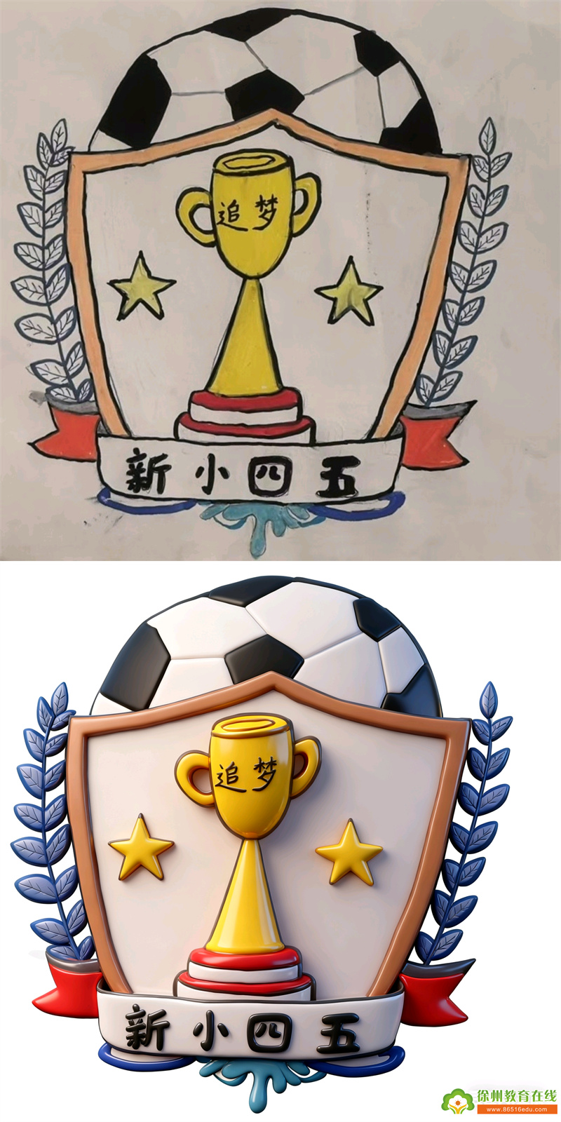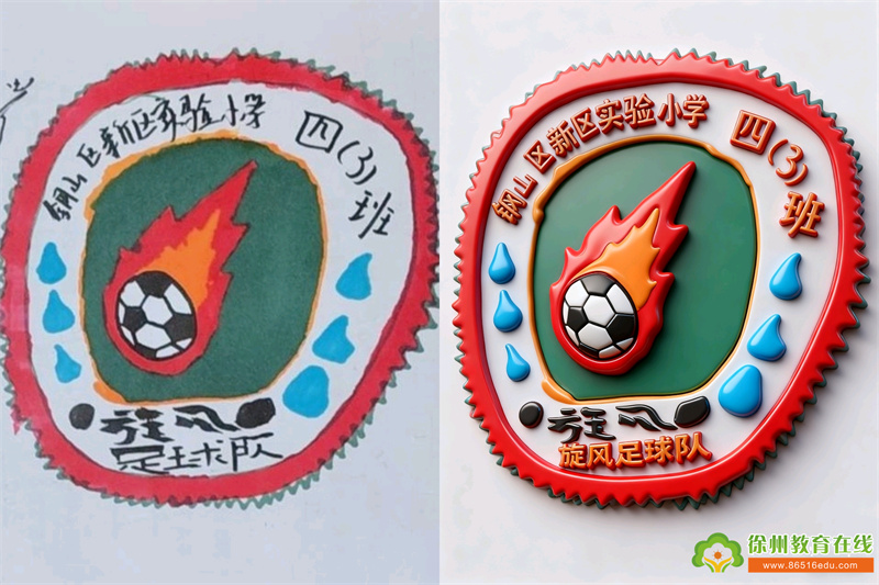 苏公网安备 32031102000486号在徐州市铜山区新区实验小学“校长杯”校园足球联赛热烈启幕之际,为深化五育并举育人理念,学校美术组与体育组跨界联动,精心策划开展班级足球队徽设计活动。活动吸引全校120名学子踊跃参与,经评审筛选,44组优秀作品成功入围,最终通过大众投票评选出2组创意佳作,正式成为班级球队专属队徽,让足球运动在艺术赋能中焕发别样光彩。