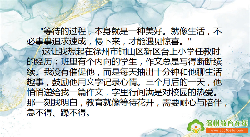 苏公网安备 32031102000486号2025年11月24日,徐州市铜山区台上小学三楼会议室内书香氤氲、交流热烈,小学语文老师杨文清以《等一朵花开》这本书为引,带来了一场温暖治愈的读书分享会,全体教师参与其中,共赴书香之约。