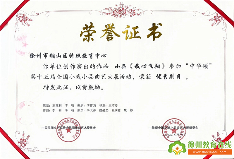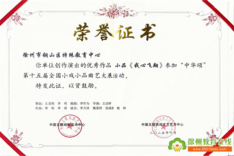 苏公网安备 32031102000486号10月29日,“中华颂”第十五届全国小戏小品曲艺大展在北京丰台区文化馆圆满落幕。本次大展高手云集,汇聚全国众多专业院团、高校大学生艺术团的精品力作,竞争尤为激烈。铜山区特殊教育中心选送的校园剧《我心飞翔》凭借独特的创作视角、真挚的情感表达和扎实的舞台呈现脱颖而出,荣获“优秀剧目”奖项,以特教力量惊艳全国舞台,尽显我校特教艺术教育成果与师生风采。此次活动由任丽副书记带队,魏铮、张满意、孙胜男老师全程负责后勤及练习事宜。王龙利校长虽未亲赴京城赛场,却始终以牵挂为纽带,全程心系前线——从前期策划的方案研讨、排练打磨的细节叮嘱,到进京演出时的实时关切、后勤保障的远程统筹,每一个环节都浸润着他的责任与期许,更凝聚着全体铜山特教人的热忱与坚守。
