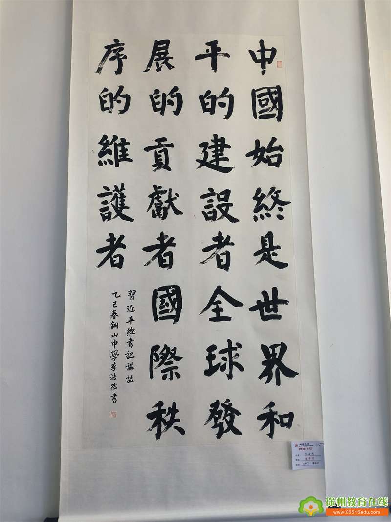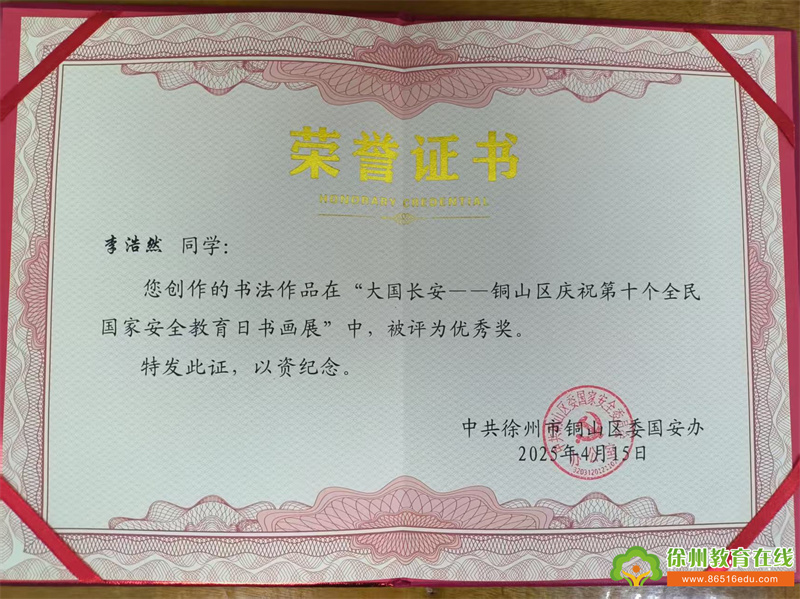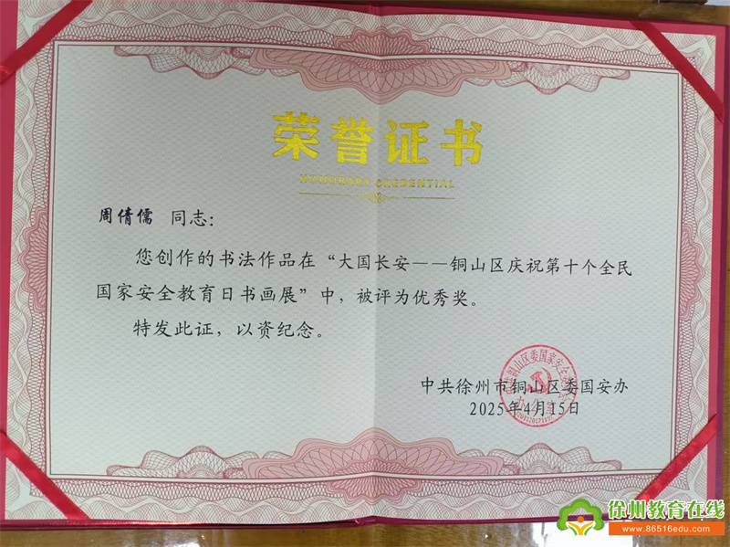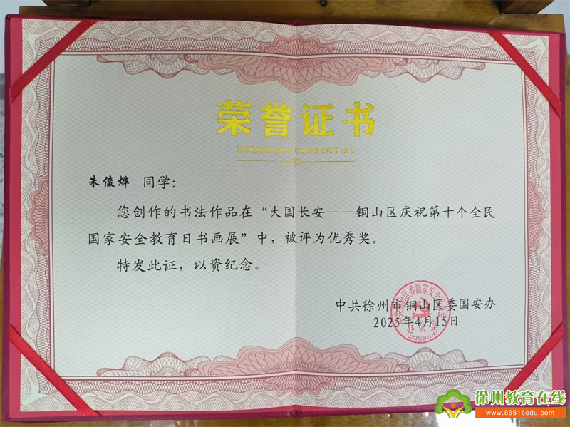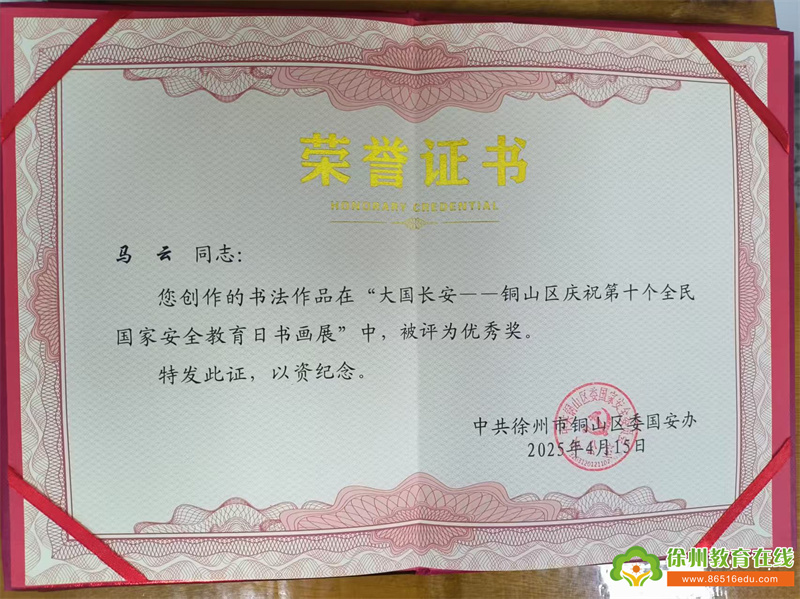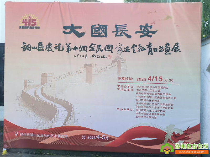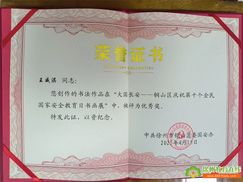 苏公网安备 32031102000486号2015年4月15日是我国第10个全国全民国家安全教育日,区委国安办联合区总工会、老干部局、机关工委、文联、教育局、文旅局等单位举办“大国长安——铜山区庆祝第十个全民国家安全教育日书画展“”。4月15日上午十点三十分,书画展开幕式在铜山区王学仲艺术展览馆隆重举行。区委国安办分管领导、市委国安办领导,书画展承办单位的主要领导和分管领导参加了本次活动。书画展上,区委相关领导给获奖作者颁发奖品,铜山中学捷报频传,我校王威淇、李浩然、朱俊烨、马同学、周倩儒五位同学凭借精湛技艺和深刻主题表达,从全区参赛者中脱颖而出,荣获教育系统优秀奖,此外我校高健和周亮老师也分获得文联系统优秀奖,无论获奖名次还是获奖人数铜山中学都在参赛的所有中小学中名列第一。