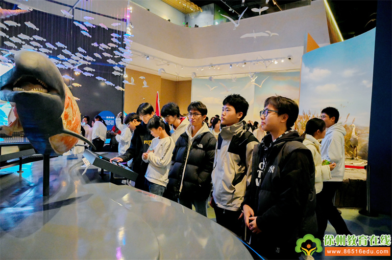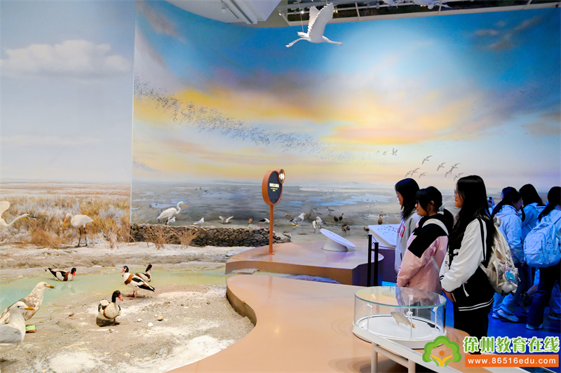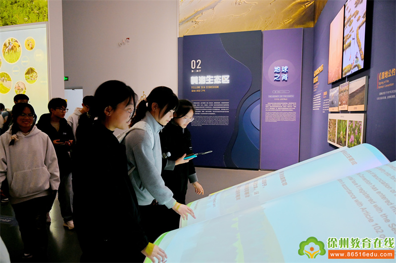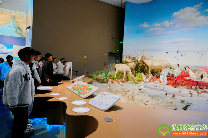 下一站,同学们走进黄海湿地博物馆。通过图文展板、实物标本、互动体验等多元形式,系统了解黄海湿地的形成历程、生态结构及珍稀动植物保护现状。从丹顶鹤的迁徙轨迹到湿地对气候调节的重要作用,同学们沉浸式感受自然与人文的共生魅力,进一步树立起尊重自然、保护生态的责任意识。