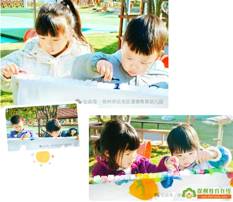 中班的宝贝们小心翼翼地将颜料滴在晶莹的冰块上,随着冰块的慢慢融化,颜料顺着水缓缓流淌,在布上晕出一道道五彩的痕迹。孩子们目不转睛,感受融化带来的变化,在观察与探索中体会到冰染艺术的独特乐趣。