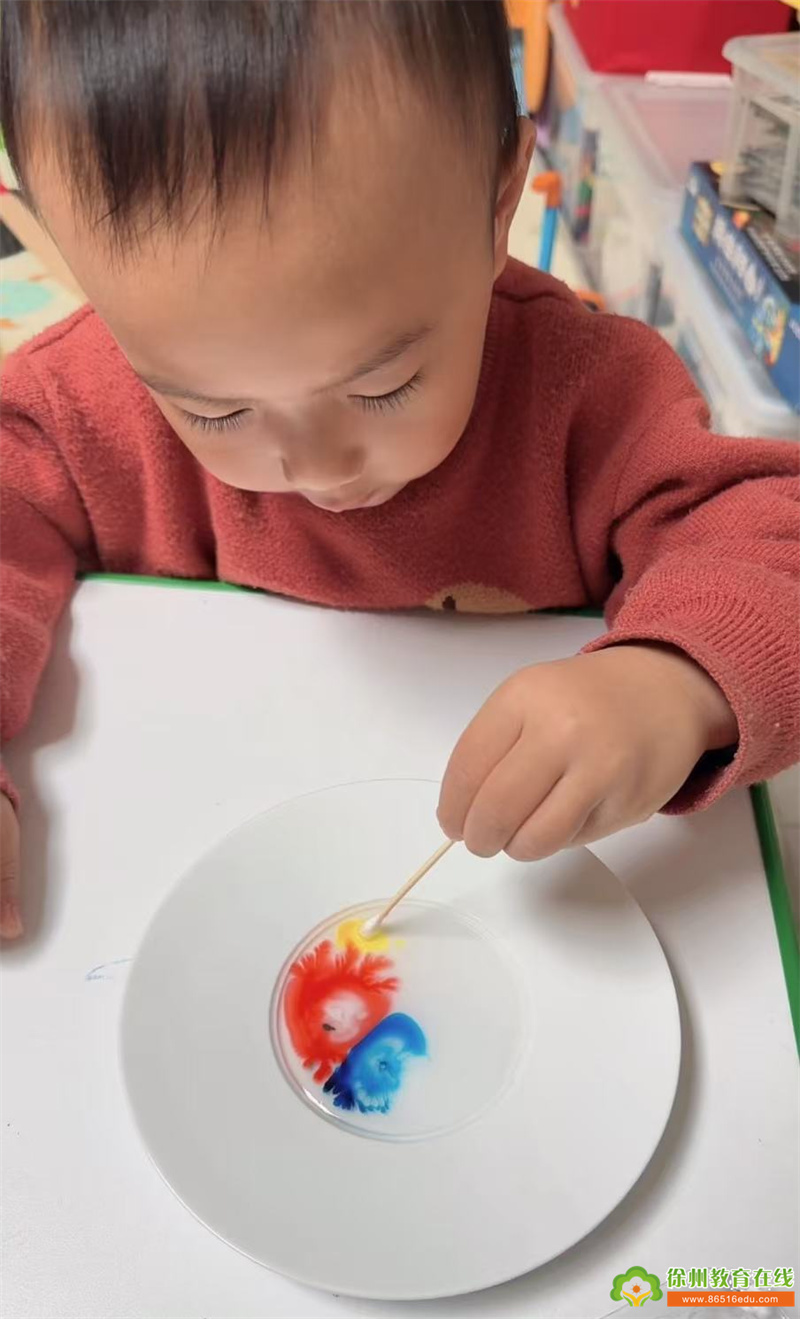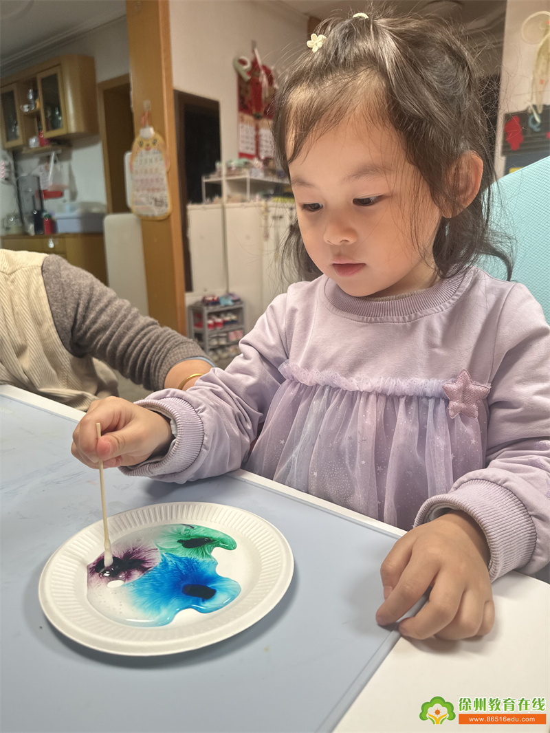 玩一玩・科学小实验:亲子携手解锁 “人造雪花” 的奥秘!利用洗洁精作为表面活性剂,破坏胶水中高分子聚合物的网络结构,再加入色彩鲜艳的色素,在水流的推动下,原本黏稠的胶水渐渐浮现出类似雪花或树枝状的不规则美丽图案。神奇的变化让孩子们惊呼不已,在趣味实验中直观感受科学与节气的奇妙联结。