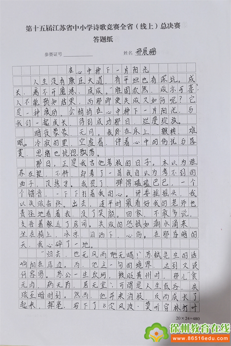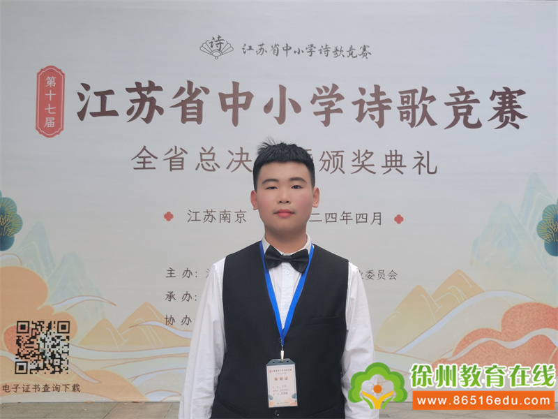 苏公网安备 32031102000486号2024年4月14日,徐州市铜山区房村镇中心小学六(1)班邢展鹏同学代表徐州决赛金陵,荣获第十七届江苏省中小学诗歌竞赛总决赛小学组特等奖,同时荣获“诗歌之星”,实现房村镇中心小学在省诗歌大赛总决赛中“四冠王”目标。