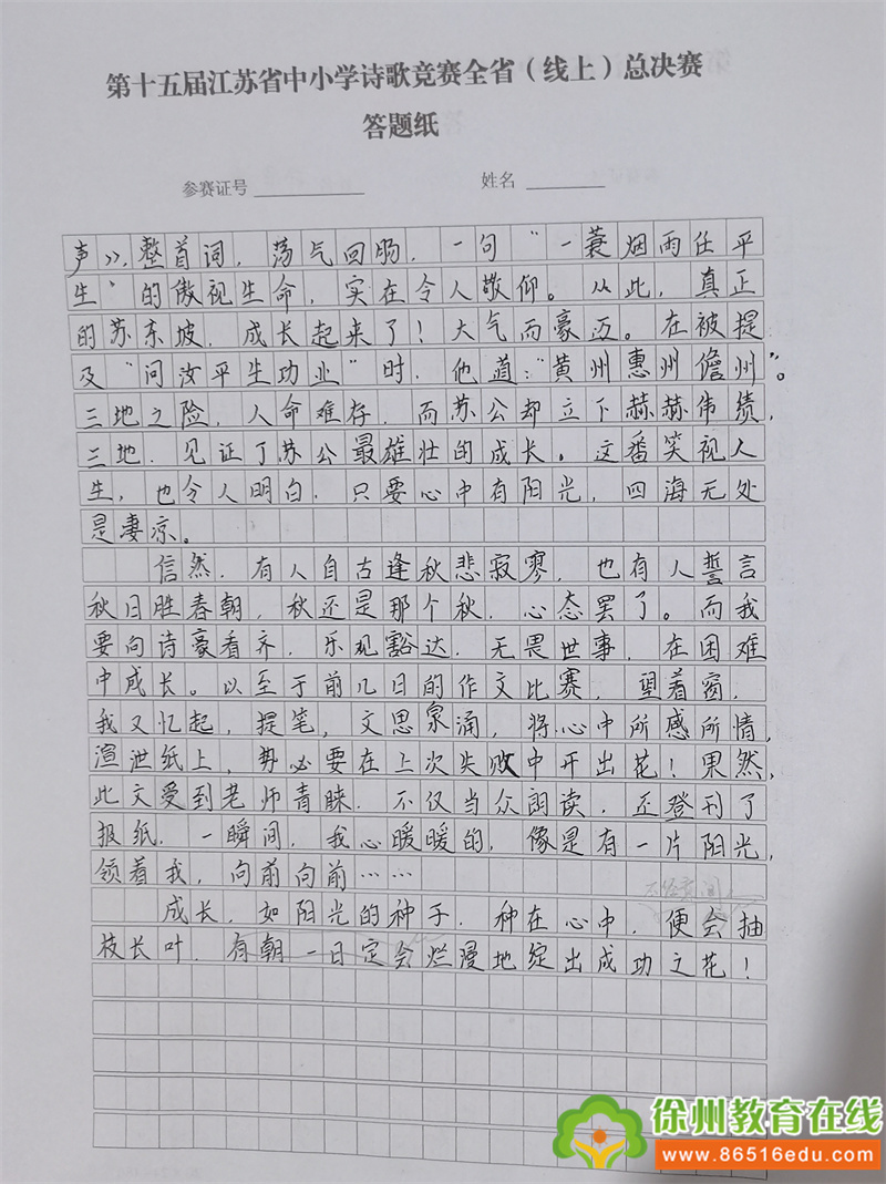 总决赛的舞台上,参赛选手需要参加笔试和现场诗歌朗诵两个环节,笔试涵盖诗歌创作、诗歌作文、诗歌仿写、诗歌默写、诗歌鉴赏等7个部分,邢展鹏同学与其他晋级选手同台竞技,凭借着厚重的诗词功底和机智的应变能力,一路过关斩将,最终载誉归来。