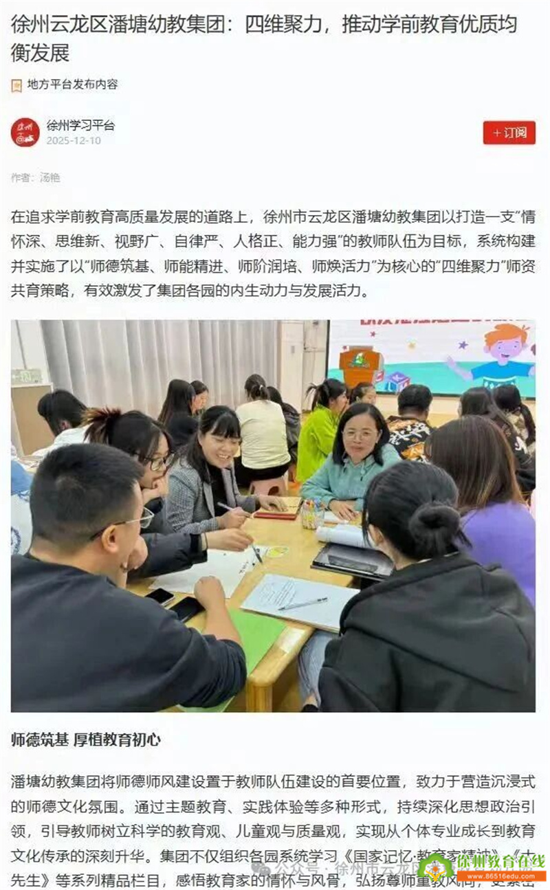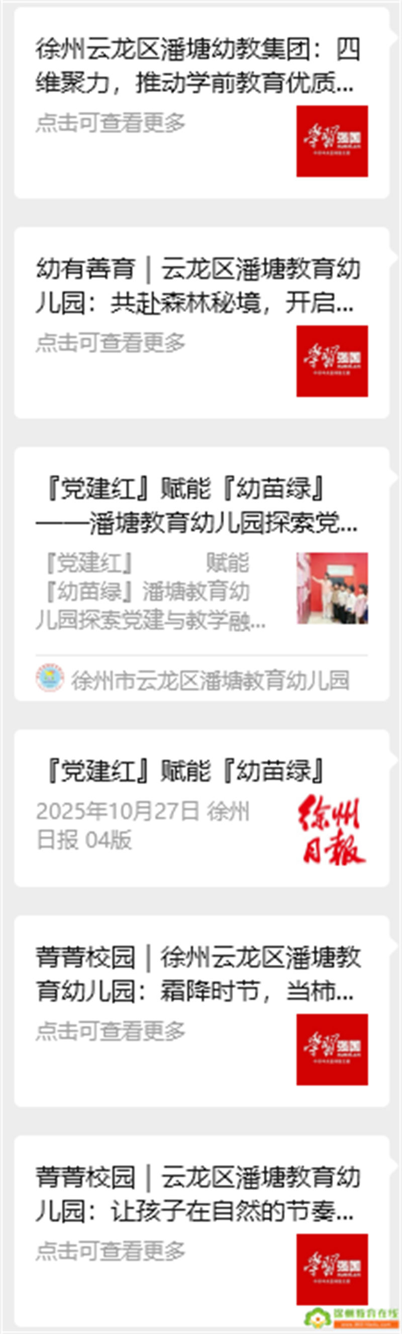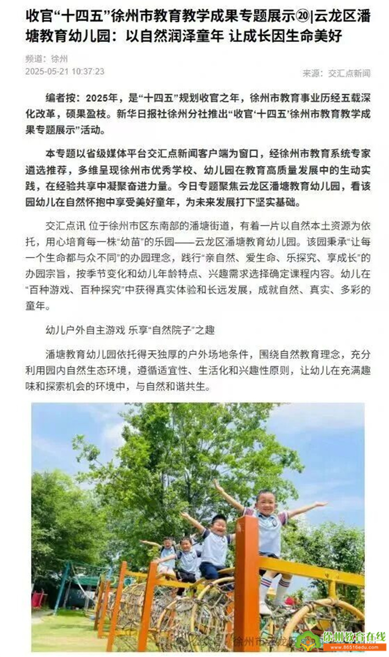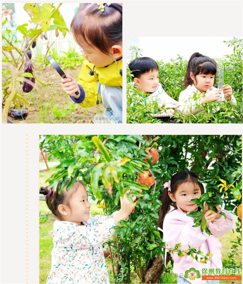 徐州市云龙区潘塘教育幼儿园是江苏省优质幼儿园。我园秉持“让每一个生命都与众不同”的教育理念,以情感为先导、能力为核心、认知为基线,全面构建幼儿园课程。在一日生活中引导幼儿观察身边常见的自然物体,自然现象,让“习以为常变新鲜”,让感官体验和身体参与融入幼儿游戏,达到培养幼儿认知自然、珍爱生命的目标。
