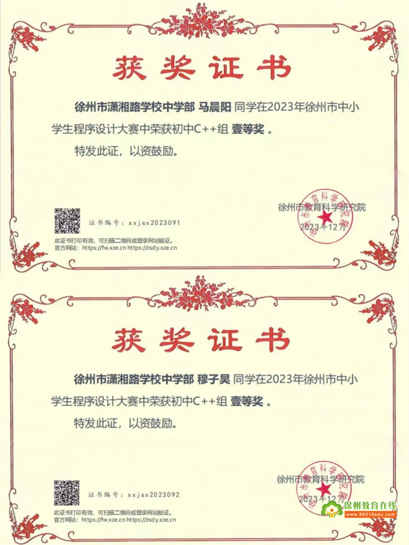 此次比赛的选手来自徐州各地区。经过激烈的角逐,徐州市潇湘路学校的学生们凭借扎实的编程基础和出色的创新能力,在此次比赛中取得优异的成绩。其中,马晨阳、穆子昊2位同学荣获一等奖,宁康宁、李泽宇、神子尧、吕翼、毕赢硕、郭宇航、张倚博7位同学获得二等奖,黄煦宸、董宇恒以及徐浩轩3位同学获得三等奖。