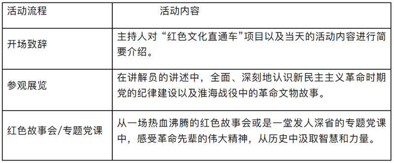 (一)场地要求:为确保展览与活动的顺利开展,需提供 80 平方米以上的室内场地用于展览布置。同时,一间配备屏幕的会议室,用于红色故事会或专题党课的开展。(二)未来惊喜:淮海战役纪念馆将持续深耕红色文化资源,将分阶段推出更多新颖独特的展览、丰富多彩的课程、生动有趣的情景剧以及沉浸式体验课,持续为红色文化传承注入新活力。