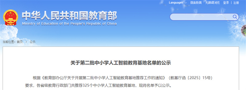 根据《教育部办公厅关于开展第二批中小学人工智能教育基地推荐工作的通知》(教基厅函〔2025〕15号)要求,各省级教育行政部门共推荐325个中小学人工智能教育基地,现将名单予以公示。