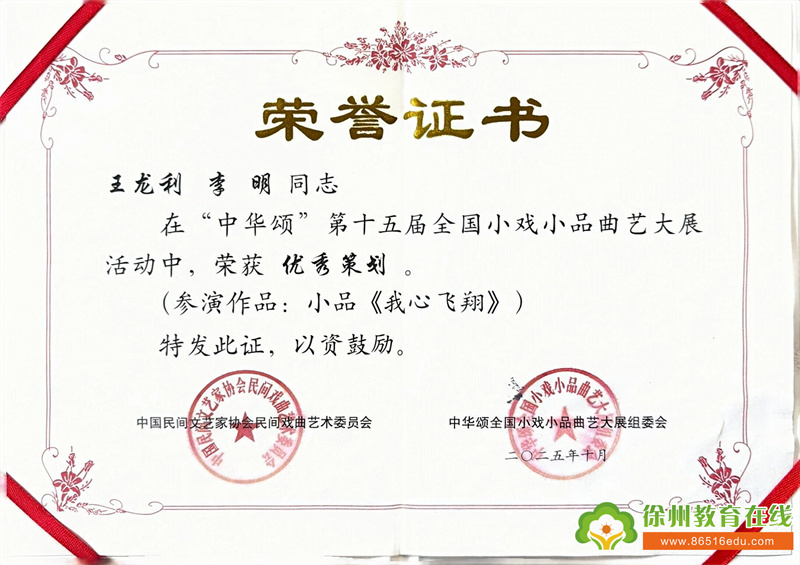 苏公网安备 32031102000486号10月29日,“中华颂”第十五届全国小戏小品曲艺大展在北京丰台区文化馆圆满落幕。本次大展高手云集,汇聚全国众多专业院团、高校大学生艺术团的精品力作,竞争尤为激烈。铜山区特殊教育中心选送的校园剧《我心飞翔》凭借独特的创作视角、真挚的情感表达和扎实的舞台呈现脱颖而出,荣获“优秀剧目”奖项,以特教力量惊艳全国舞台,尽显我校特教艺术教育成果与师生风采。此次活动由任丽副书记带队,魏铮、张满意、孙胜男老师全程负责后勤及练习事宜。王龙利校长虽未亲赴京城赛场,却始终以牵挂为纽带,全程心系前线——从前期策划的方案研讨、排练打磨的细节叮嘱,到进京演出时的实时关切、后勤保障的远程统筹,每一个环节都浸润着他的责任与期许,更凝聚着全体铜山特教人的热忱与坚守。