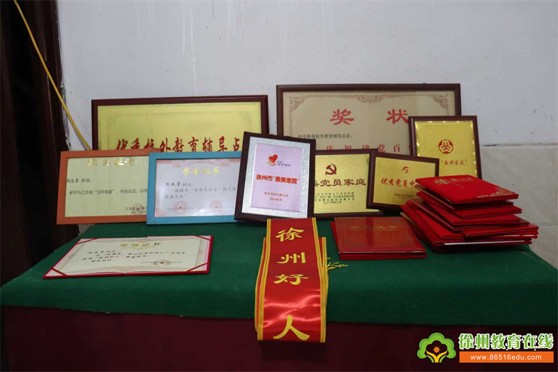 有小记者问:“周爷爷你好,您荣获徐州好人,江苏省关心下一代工作先进个人、省“五好家庭”等称号,请你介绍一下你的事迹好吗?”周廷章主任清了清嗓子高兴地说:“欢迎小记者到家里参观采访,我家庭中有4名中共党员,始终将对党的忠诚放在首位,将红色基因深深植入家风之中,引导子女树立正确的世界观、人生观和价值观,确保红色基因代代相传。我们家荣获 “区优秀党员中心户”,这是组织对家庭的高度认可和赞誉,更是一份沉甸甸的责任与使命。村里每月一次党群学习活动日,我身为一名“政策宣传员”,把自己联系的12名党员和群众请到家里,宣讲党的方针政策和时事热点,让党的“好声音”真正飞入寻常百姓家。退休后,我退而不休,积极发挥余热,担任了街道关工委常务副主任,将全部心血倾注在关心下一代事业上,被大家称为“老积极”、“老关工”,孩子们亲切地称我为“糖爷爷”。积极加入村里的夕阳红志愿服务队,承担起“护学岗”的职责,放学前,我带着队伍在学校门口,疏导交通,为学子们保驾护航。在村里举办的各类公益活动中,无论是修桥补路、植树造林,还是环境整治、卫生清洁,总能看到我们一家老少忙碌的身影。我还是村里“道德讲堂”的主讲人,自编打印了《国学精读》200份,免费发放给村民。当得知邻里乡亲的困难家庭遭遇不幸变故时,我们家庭将毫不犹豫地伸出援手,给予及时的关怀和帮助。为贫困学生慷慨解囊、捐资助学,为身患重病的邻居送去慰问金和温暖关怀。
