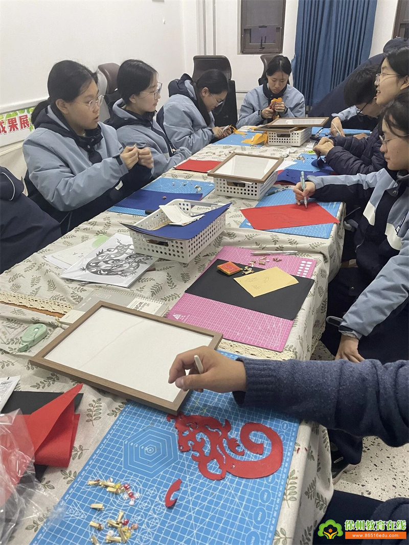 围绕传统文化传承,文创社推出“龙纹剪纸”主题创作活动。社员们以徐州博物馆S型龙纹为创作载体,深入学习剪纸非遗技艺与龙的生肖文化内涵,从纹样设计、色彩搭配到裁剪装裱,全程自主完成创作。最终成型的龙形剪纸作品色彩丰富,红、蓝、黄等色调搭配和谐,龙纹灵动飘逸,将传统剪纸技艺与现代审美巧妙融合。不少社员还为作品定制装裱框架,让剪纸从传统手工艺品升级为兼具观赏性与收藏性的文创精品,让非遗技艺在校园场景中焕发新的生命力。